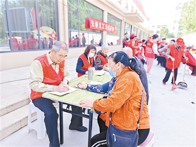 4月20日,在召陵區(qū)煙廠花園,趙國鎖(左一)為居民測量血壓、記錄數(shù)據。