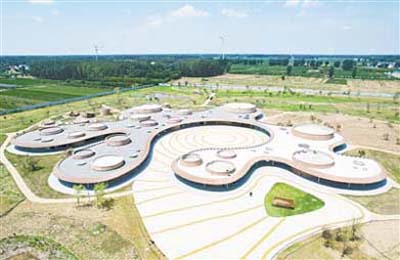 記者來到賈湖遺址博物館,映入眼簾的是古樸圓形建筑群。此建筑群整體外形像濺開的水滴。陳列展區(qū)分為“禮樂之源”1個(gè)主題展廳和“賈湖探秘”“骨笛”“龜甲與符號(hào)”“墓葬與葬禮”4個(gè)專題展廳。每個(gè)展廳運(yùn)用人工智能、5G、MR、雷達(dá)投影互動(dòng)、3D動(dòng)畫等高新技術(shù),讓人們通過聲、光、電、影全方位感受賈湖文化的巨大魅力。