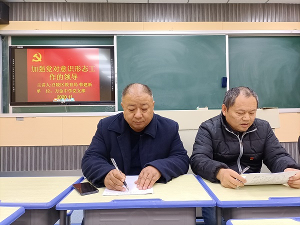 為加強(qiáng)黨對(duì)意識(shí)形態(tài)工作的領(lǐng)導(dǎo),穩(wěn)固基層黨員教師的意識(shí)形態(tài)工作,11月30日下午,召陵區(qū)教育局韓建新同志,在萬(wàn)金中學(xué)東校區(qū),給萬(wàn)金鎮(zhèn)全體黨員教師上了《加強(qiáng)和改進(jìn)黨對(duì)意識(shí)形態(tài)工作的領(lǐng)導(dǎo)》的思政課,此次會(huì)議由萬(wàn)金中學(xué)黨支部副書(shū)記張曉斌同志主持。