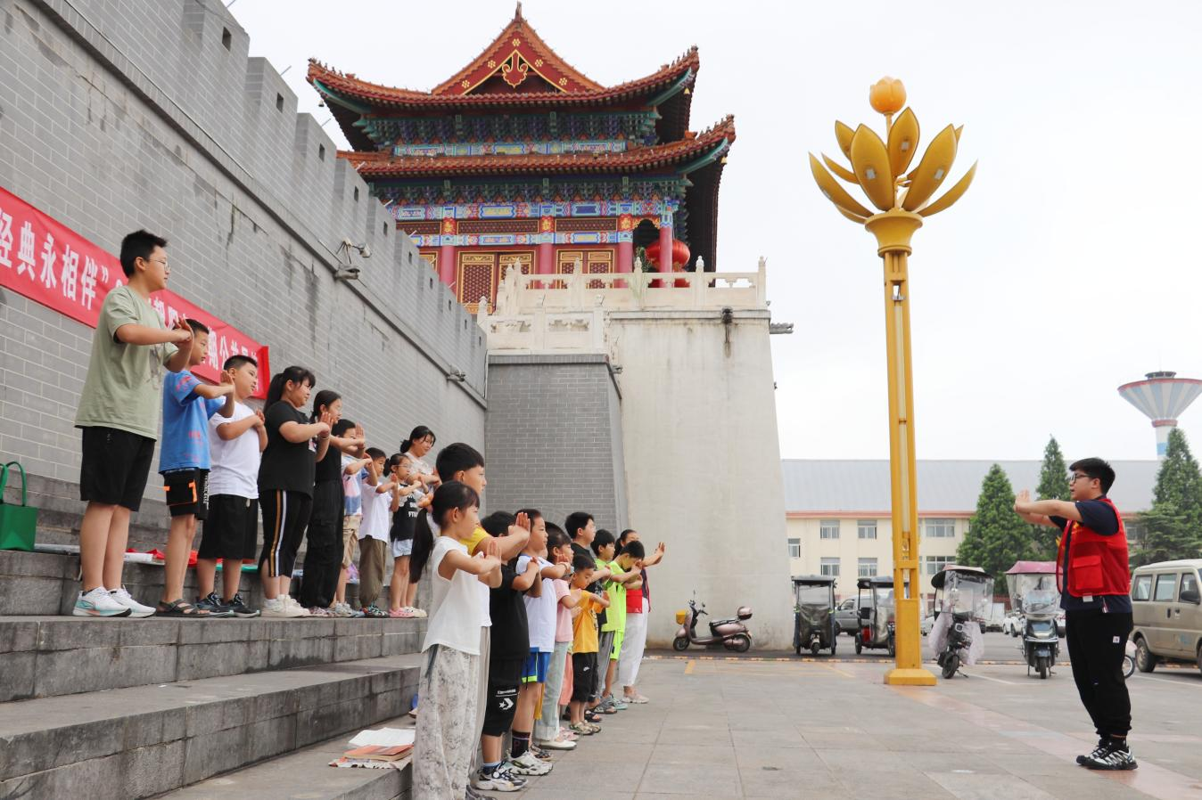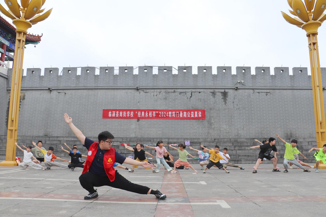 “沖拳!一,哈!二,哈!……”清晨,在漯河市臨潁縣南街村朝陽(yáng)門廣場(chǎng)激蕩著響亮的口號(hào)聲,這聲音整齊劃一、鏗鏘有力,伴隨著氣勢(shì)十足的聲音,只見(jiàn)孩子們做出馬步、穿掌、沖拳、踢腿等經(jīng)典的武術(shù)招式,動(dòng)作有力,虎虎生風(fēng)。