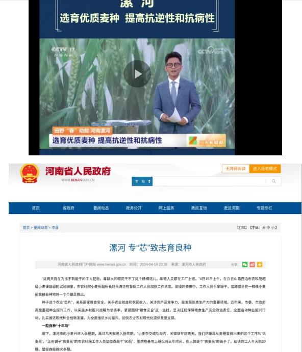 2024年,在市級以上媒體宣傳報道90余篇?!秾?ldquo;芯”致志育良種》被省政府官網(wǎng)報道,科技服務(wù)春耕春管工作被《河南日報》《科技日報》報道,《選育優(yōu)質(zhì)麥種提高抗逆性和抗病性》小麥新品種選育工作4月26日被央視報道。