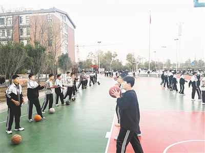 3月6日9點40分,下課鈴聲響起,郾城中學的學生迅速涌向操場。學生們排好隊,在老師的帶領下有節(jié)奏地跑步、拉伸放松,分組參與立定跳遠、跳繩、籃球等豐富多彩的體育項目。每一組學生都有體育教師指導,確保他們掌握正確的運動技巧,操場上洋溢著青春的氣息。