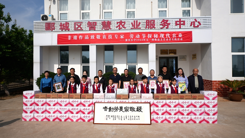 活動伊始,漯河小學學生代表王彬宇、王鈺萱、田景銳、夏華苒深情朗誦獻詞《致敬農(nóng)技專家》。隨后,少先隊員們將精心準備的剪紙、書法、繪畫等非遺作品贈予農(nóng)技專家,以表達對這些“大地追夢人”的崇高敬意。隨后,漯河市郾城區(qū)農(nóng)業(yè)農(nóng)村局黨組書記、局長張韶杰等領(lǐng)導及農(nóng)業(yè)科學家團隊代表登臺,接受這份滿含童真與感恩的心意,并與少先隊員們合影留念。