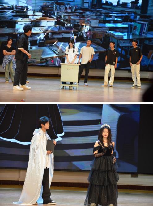 活動(dòng)現(xiàn)場(chǎng),演出學(xué)生憑借扎實(shí)的臺(tái)詞功底、細(xì)膩的肢體語(yǔ)言與極具感染力的情緒表達(dá),將角色刻畫得入木三分。幕后團(tuán)隊(duì)同樣“星光閃耀”,從手繪道具、動(dòng)態(tài)背景投影到音效配合,每個(gè)環(huán)節(jié)都彰顯著同學(xué)們的匠心巧思。現(xiàn)場(chǎng)的評(píng)委老師從劇本創(chuàng)意、表演技巧、舞臺(tái)效果等多個(gè)維度對(duì)各劇目進(jìn)行了綜合評(píng)分,。最后夢(mèng)想合唱團(tuán)的合唱“世界贈(zèng)與我”與說(shuō)文解字社團(tuán)的“字圣故里美少年 說(shuō)文解字話傳承”環(huán)節(jié),更是點(diǎn)燃全場(chǎng)熱情將全場(chǎng)氣氛推入高潮,將藝術(shù)欣賞與音樂(lè)文學(xué)深度交融。