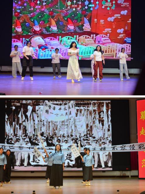 當(dāng)天演出在漯彎春韻的舞蹈中拉開帷幕,從《寶玉大婚》《西安事變》《白雪公主和丫鬟們》《破曉》等經(jīng)典劇目的深度改編,到聚焦校園生活、社會(huì)熱點(diǎn)的劇本《再看五分鐘》《當(dāng)考試還剩15分鐘》《誰(shuí)逼瘋了周日》《回不去的十七歲》等,同學(xué)們以敏銳的觀察力捕捉生活細(xì)節(jié),用戲劇語(yǔ)言傳遞青春思考。高一(13)班的《破曉.她時(shí)代》通過(guò)講述一群率先覺(jué)醒的女大學(xué)生,沖破了舊思想的牢籠,以青春和熱血,為自由和平等而吶喊;高一(15)班高一(16)班的《文字彼岸的他們》通過(guò)時(shí)空交錯(cuò)的敘事,講述了三代女性的讀書世界,倡導(dǎo)讀書的重要性。高一(9)班的《金陵十三釵》則以極具現(xiàn)代感的舞美設(shè)計(jì)和沉浸式表演,賦予傳統(tǒng)故事新的生命力。高一(3)班高一(4)班《回不去的17歲》以兩代人的真實(shí)經(jīng)歷改編,引發(fā)學(xué)生對(duì)青春,責(zé)任和奉獻(xiàn)的思索,引發(fā)了陣陣掌聲。