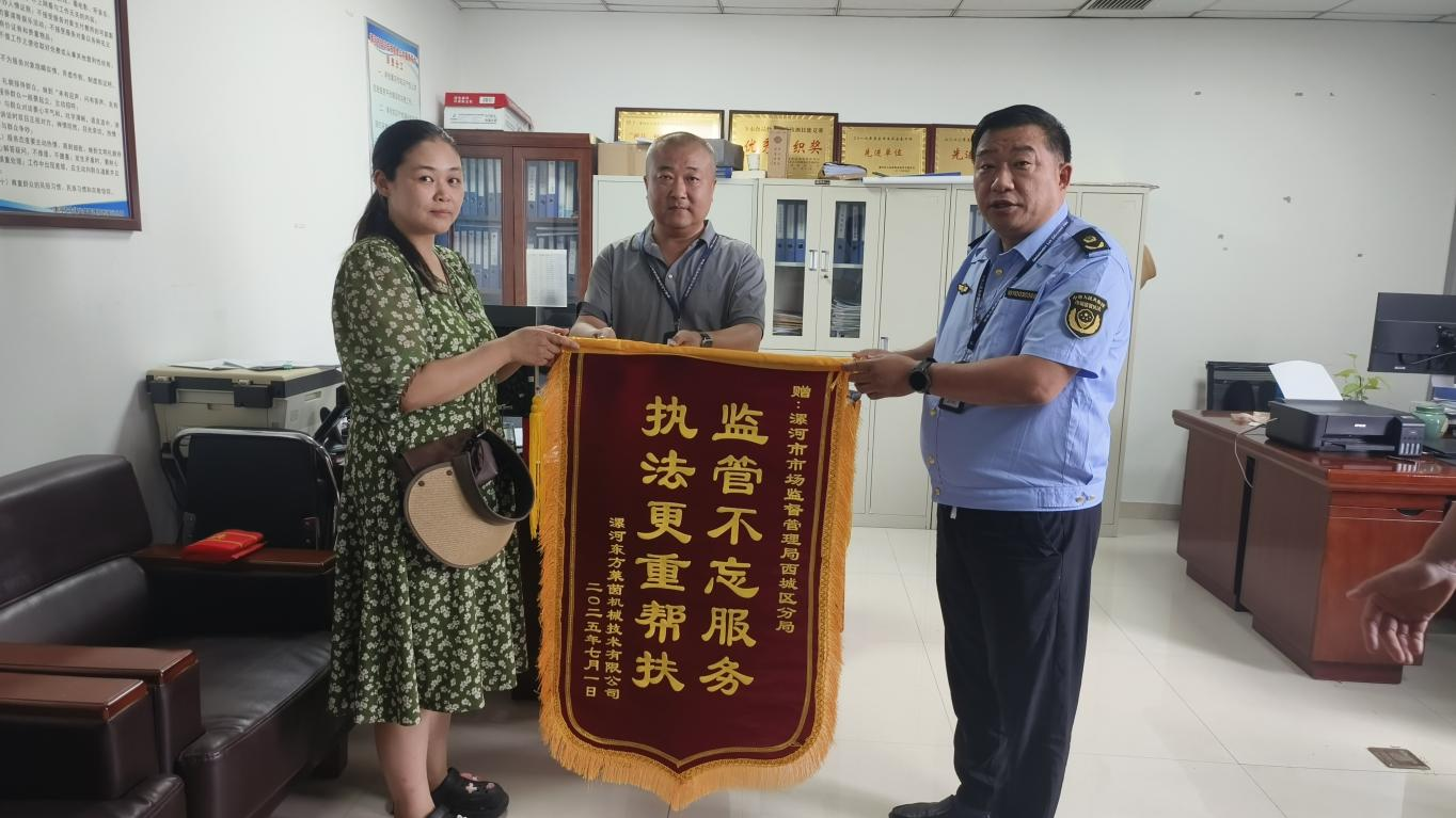 2025年7月7日下午,一名企業(yè)工作人員將一面繡著“監(jiān)管不忘服務(wù)、執(zhí)法更重幫扶”的錦旗送到漯河市市場(chǎng)監(jiān)督管理局西城區(qū)分局執(zhí)法人員手中,以表達(dá)對(duì)該局執(zhí)法人員幫扶企業(yè)的感謝之情。