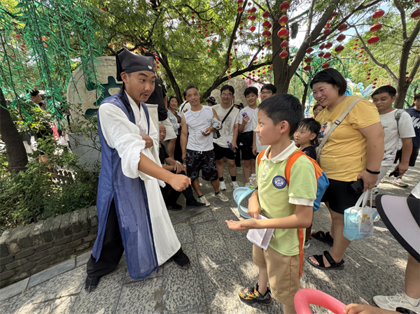 一踏入萬歲山武俠城,古色古香的宋代街巷和建筑便映入孩子們眼簾,仿佛穿越回了千年前的大宋。街道上,鄭記肉鋪、獅子樓、王婆茶莊等實景店鋪,充滿生活氣息,孩子們好奇地打量著,想象著古人的生活場景。街邊藝人的精彩表演引得孩子們陣陣驚嘆,歡呼聲此起彼伏?!度蜃<仪f》里,逼真的城墻、城門、大炮和烽火臺,激烈的戰(zhàn)斗場面配合影視爆破、云梯炮戰(zhàn)、大型馬術等實景拍攝技術,將《水滸傳》中的情節(jié)鮮活呈現(xiàn),孩子們看得目不轉睛,被綠林好漢們的江湖豪情深深吸引,演出結束后,掌聲雷動。在萬歲山武俠城內,孩子們還觀賞了多場精彩絕倫的演出。從《吊環(huán)》的驚險特技到《大宋奇兵》的英勇無畏,再到《李逵斷案》和《林沖戰(zhàn)楊志》……此外,孩子們還進行了一系列互動體驗活動。通過石頭剪刀布、投壺等游戲來賺取銀票,換取自己喜歡的物品。每一場演出都讓孩子們陶醉其中,流連忘返。