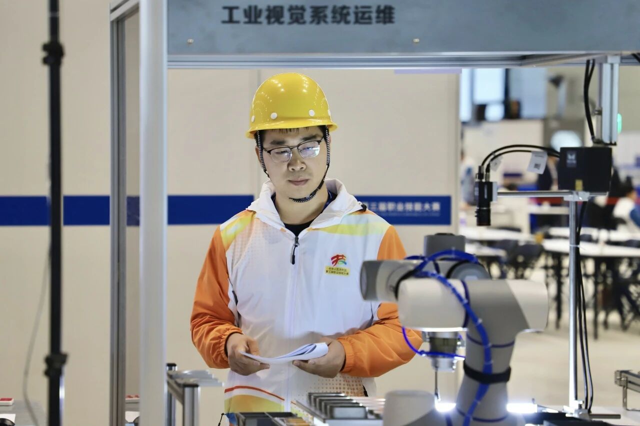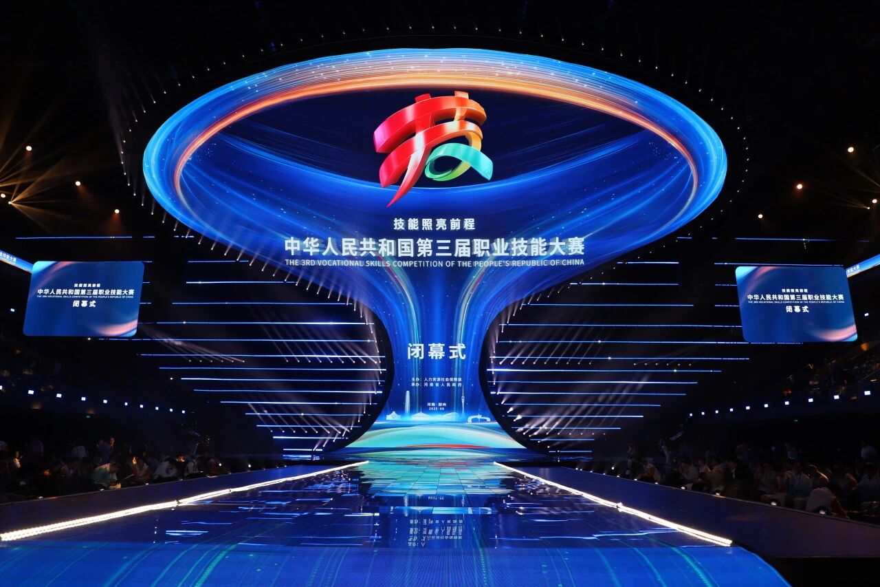 中華人民共和國第三屆職業(yè)技能大賽閉幕式上,自主移動機(jī)器人(世賽選拔項(xiàng)目)金牌獲得者楊奇瑞、介明鑫,工業(yè)視覺系統(tǒng)運(yùn)維(國賽精選項(xiàng)目)金牌獲得者王華磊,機(jī)器人系統(tǒng)集成(世賽選拔項(xiàng)目)銀牌獲得者彎有道、王永康上臺領(lǐng)獎。