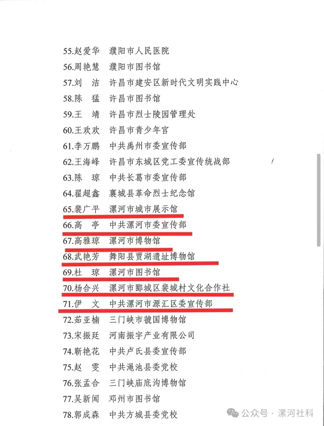 2024年社科普及志愿服務(wù)活動表現(xiàn)突出社科普及指導(dǎo)員(7名):裴廣平(漯河市城市展示館);高亭(中共漯河市委宣傳部);高雅瓊(漯河市博物館);武艷芳(舞陽縣賈湖遺址博物館);杜瓊(漯河市圖書館);楊合興(漯河市郾城區(qū)裴城村文化合作社);伊文(中共漯河市源匯區(qū)委宣傳部)