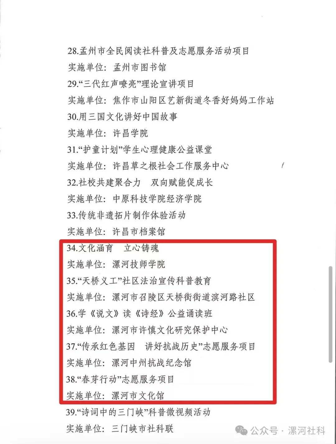 2024年表現(xiàn)突出社科普及志愿服務(wù)活動項目(5個):文化涵育 立心鑄魂(實施單位:漯河技師學(xué)院);“天橋義工”社區(qū)法治宣傳科普教育(實施單位:漯河市召陵區(qū)天橋街街道濱河路社區(qū));學(xué)《說文》讀《詩經(jīng)》公益誦讀班(實施單位:漯河市許慎文化研究保護中心);“傳承紅色基因 講好抗戰(zhàn)歷史”志愿服務(wù)項目(實施單位:漯河中州抗戰(zhàn)紀(jì)念館);“春芽行動”志愿服務(wù)項目(實施單位:漯河市文化館)