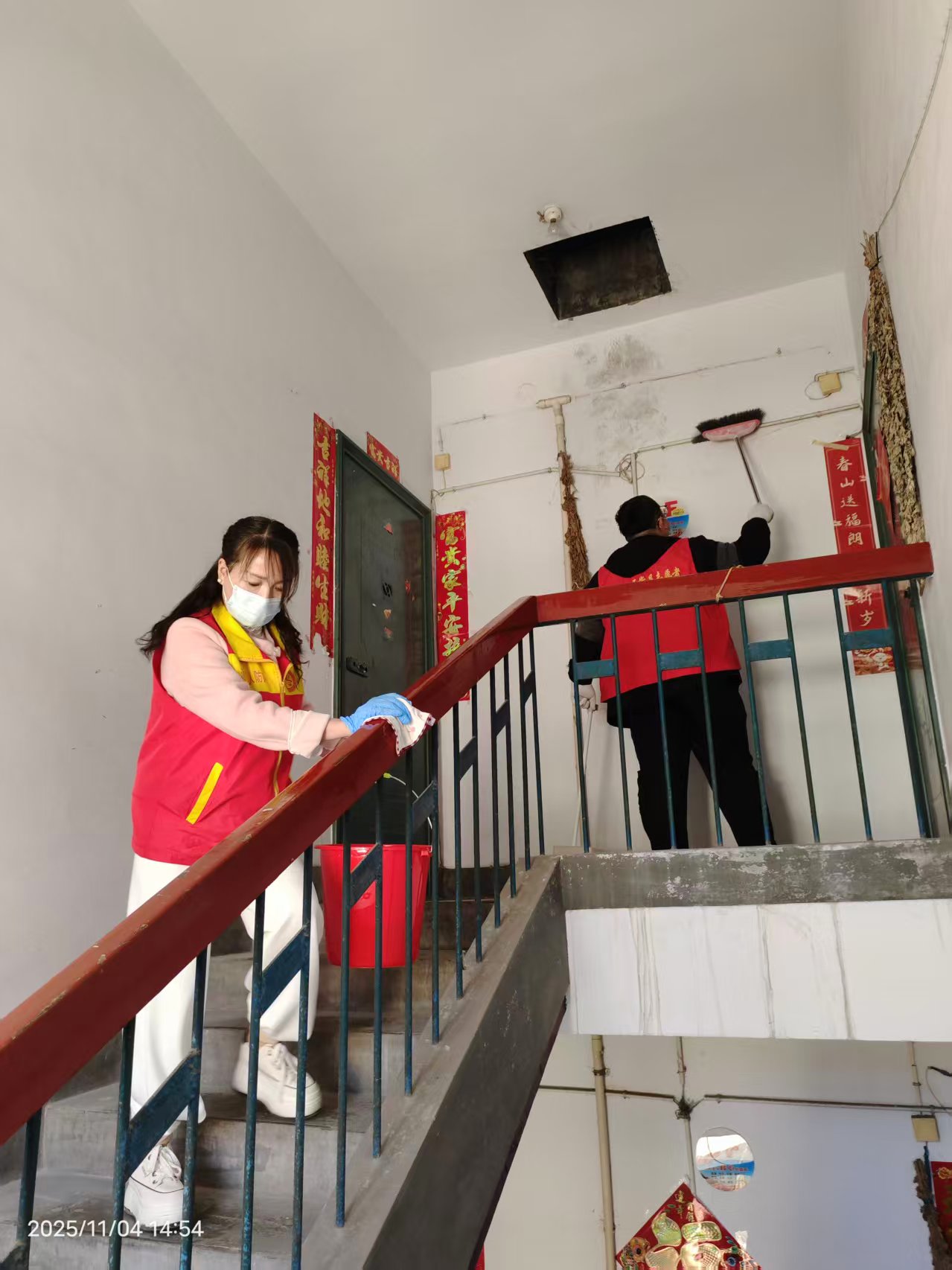 步梯扶手的“溫柔擦拭”: 日積月累的灰塵讓原本光滑的扶手變得斑駁。志愿者們手持抹布,浸濕、擰干,從頂層開(kāi)始,一級(jí)一級(jí)臺(tái)階地向下擦拭。每一根欄桿、每一寸扶手都恢復(fù)了木制或鐵藝的本色,居民上下樓時(shí),掌心觸及的不再是灰塵,而是一份安心。
