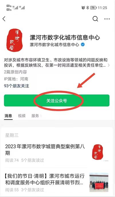 在微信搜索欄中搜索“漯河市數(shù)字化城市信息中心”或通過掃描二維碼關(guān)注公眾號。關(guān)注微信公眾號后,首先打開手機(jī)GPS定位功能。