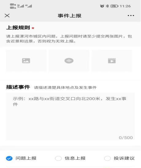 根據(jù)上報(bào)規(guī)則上報(bào)發(fā)現(xiàn)問題,可以選擇使用圖片(至少上傳兩張圖片,分別包含遠(yuǎn)景和近景)或視頻錄像等方式上傳問題,在描述事件處需將所舉報(bào)問題及具體道路位置描述清楚,再次確認(rèn)定位無誤,隨后點(diǎn)擊提交即完成上報(bào)。