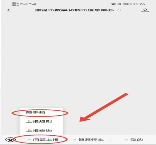 在微信中搜索“漯河市數(shù)字化城市信息中心”微信公眾號。關(guān)注微信公眾號后,首先打開手機(jī)GPS定位功能,點(diǎn)擊屏幕左下方“問題上報(bào)”,選擇“隨手拍”欄后,根據(jù)提示內(nèi)容操作,問題上報(bào)后可隨時(shí)查詢處置進(jìn)度。