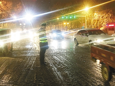 記者在多個(gè)路口看到,許多民警也在冒雪指揮交通。記者了解到,市區(qū)的輔警和騎警全員出動(dòng),且大部分從下午上崗到晚上7點(diǎn),沒(méi)有休息過(guò)一分鐘。