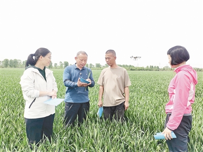 李世民(左二)向趙惠杰(右二)講解小麥病蟲害防治要點。