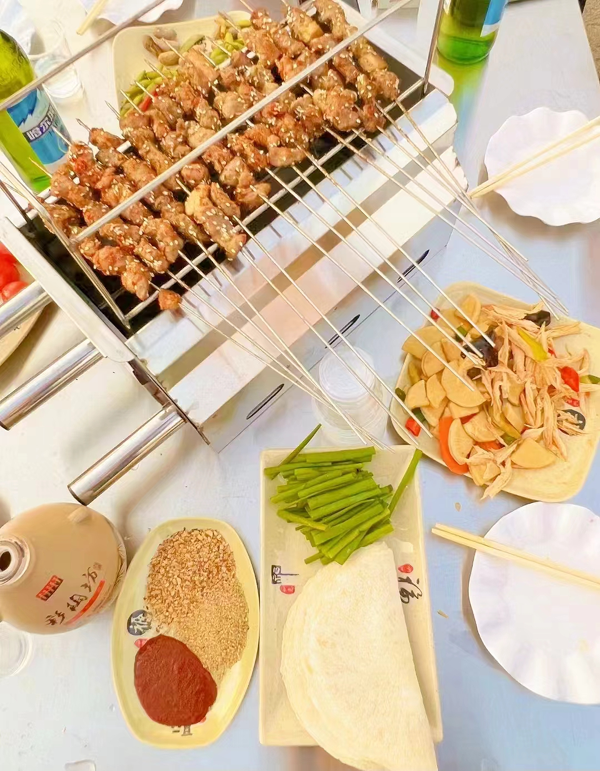 伴著夕陽(yáng)的余暉,鼓風(fēng)機(jī)在爐頭轟鳴,肉已提前腌過(guò),猛火之上,油脂淋漓,廚師取毛刷蘸醬在肉面簡(jiǎn)單一抹,油料肉汁灑在火上,橘色的火舌頭將那肉串舔上七八回,帶著猛烈的葷氣,油脂的香味瞬間四溢開來(lái),將烤好的肉串取下,在蘸料中一滾,餅放在手上,串放在餅上,而后手攥餅將肉從簽子上擼下,將一段小蔥對(duì)折,蘸些秘制醬放在餅內(nèi),整個(gè)悶入口中,享受著滋滋冒油的烤串、碳水以及鮮蔬在口腔的對(duì)撞,咀嚼間豐腴醇厚滋味迸發(fā)在唇齒間,瞬間喚醒的味蕾把我們帶回鄉(xiāng)土田園的時(shí)光,奔赴一場(chǎng)久別的兒時(shí)重逢,撩撥起我們內(nèi)心最柔軟的情感,共繪一副人間煙火畫卷。(通訊員:楊麗麗 張付慶)