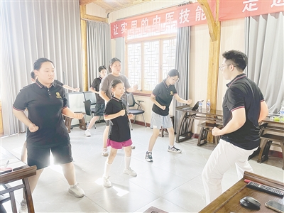 目前正值暑假,知育學(xué)堂內(nèi)的青少年中醫(yī)夏令營活動正在進(jìn)行中。記者在夏令營的活動教室看到,十幾個孩子跟著老師練習(xí)八段錦。參加夏令營的孩子們來自天津、河北、鄭州等。“我媽媽從河北開車把我送到這里,主要是為了培養(yǎng)我對中醫(yī)的興趣,讓我了解如何調(diào)理自己的身體。”今年12歲的陳榮告訴記者。