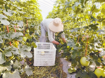 在甜瓜大棚,翠綠的甜瓜秧爬滿了架子,甜瓜個(gè)大體重、色澤誘人。“‘綠寶’甜瓜一上市就供不應(yīng)求。這幾天我們?cè)黾恿巳耸?,加快采摘、裝車(chē),爭(zhēng)取讓市民早一點(diǎn)兒嘗‘鮮’。”工人薛鳳蘭看著眼前掛滿棚架的“綠寶”甜瓜高興地說(shuō),“綠寶”甜瓜與普通甜瓜相比,糖度高、肉質(zhì)細(xì)脆多汁、口感清甜爽口,且含有大量的維生素等。大棚內(nèi)除了種植有“綠寶”甜瓜外,還有“星甜22”甜瓜、美都西瓜、櫻桃番茄等。