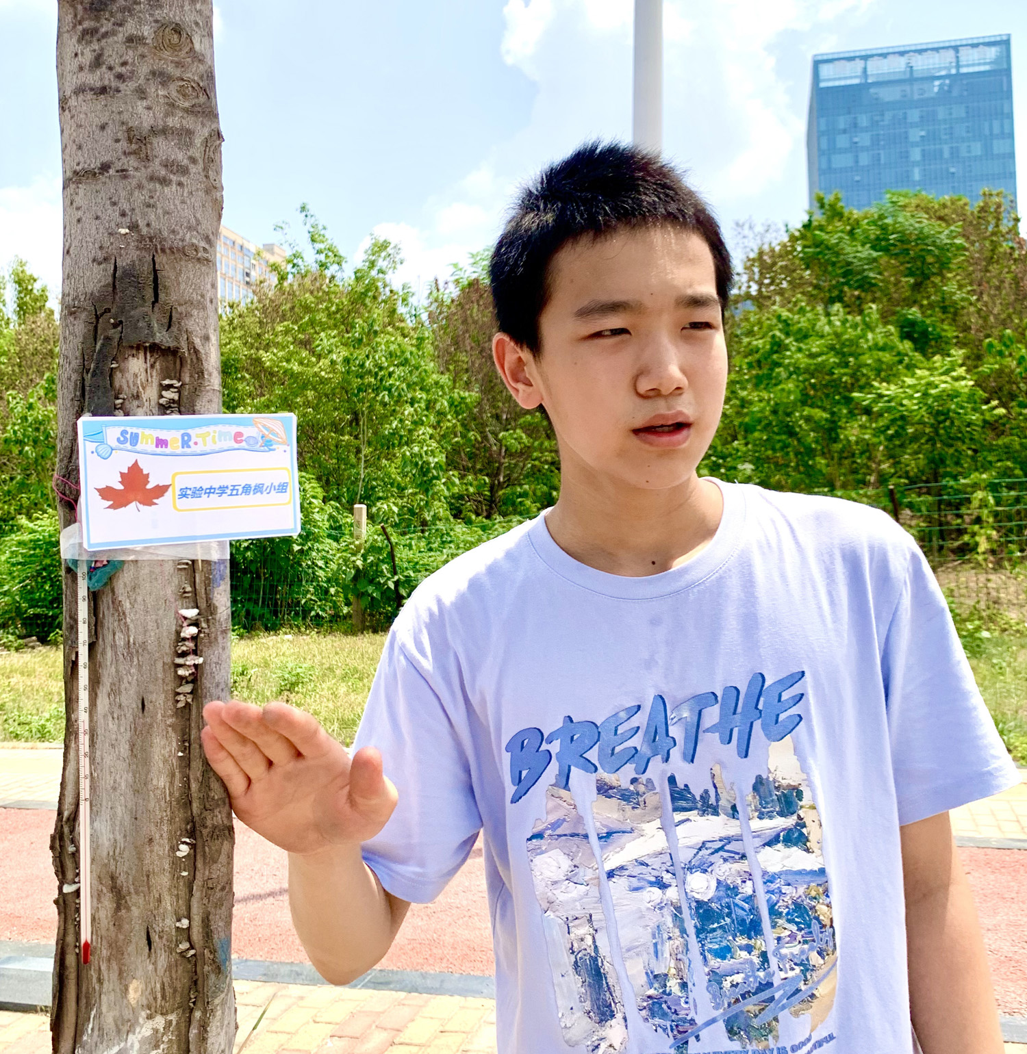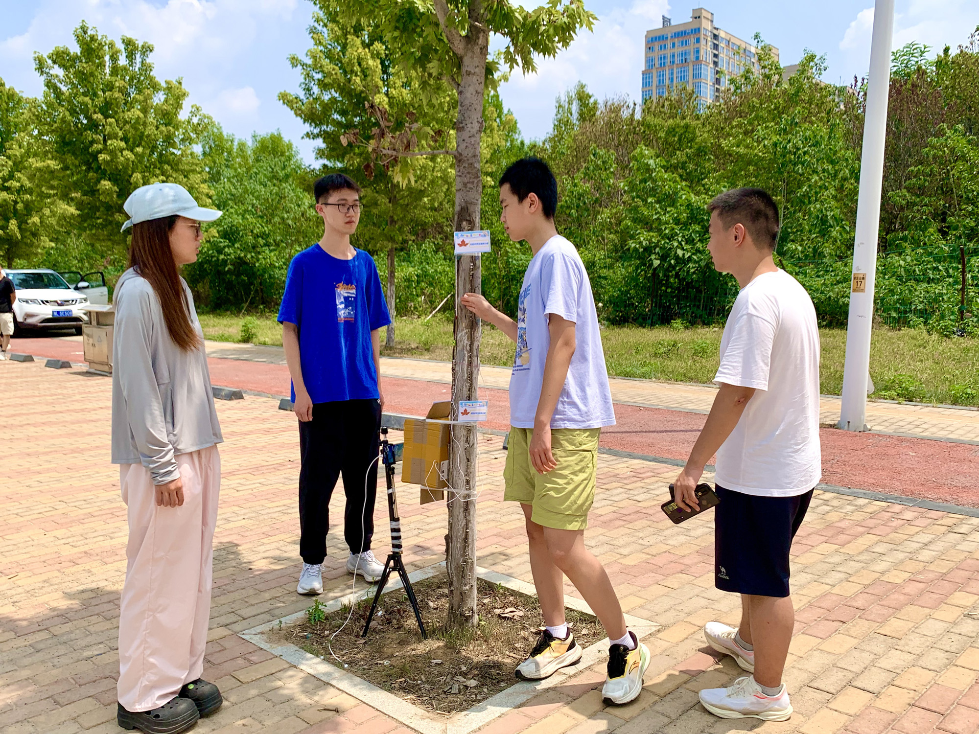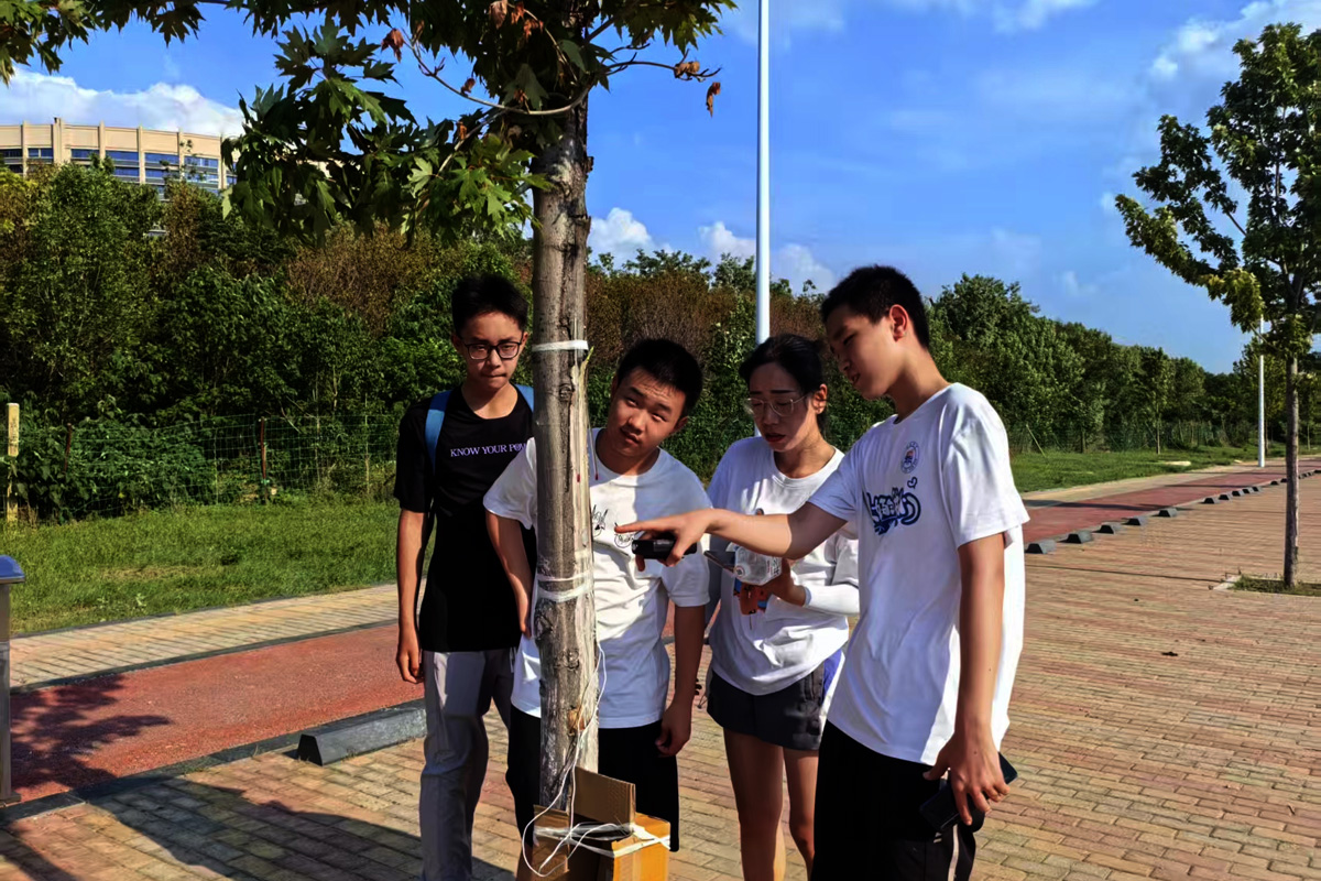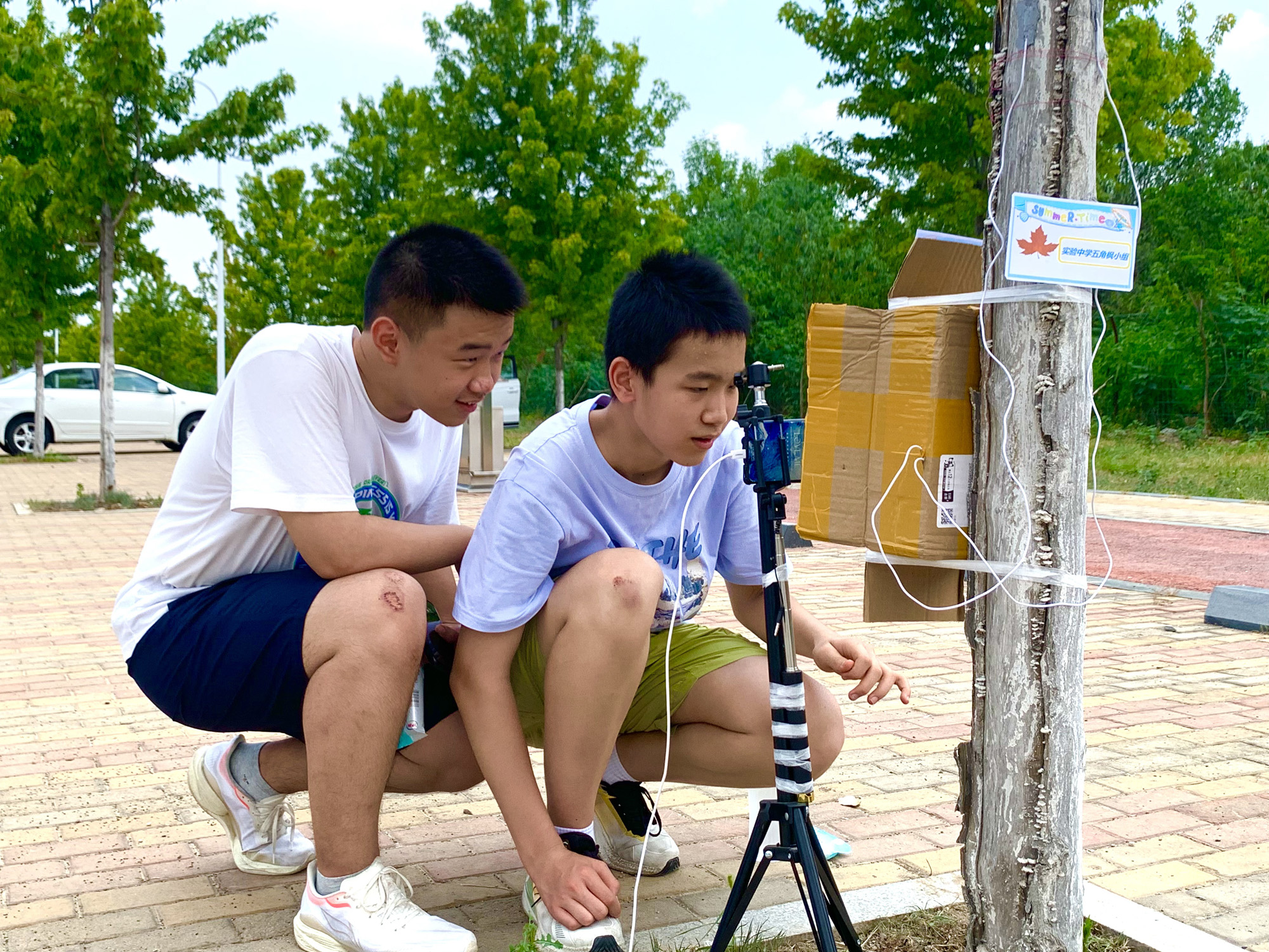 7月18日午時,西城凌云山路,40℃的高溫炙烤著大地。在炎炎烈日下,兩個稚嫩的少年正蹲在一棵小樹前,手里拿著儀器,專注地觀察著什么。刺眼而毒辣的陽光灑在他們的身上,他們卻仿佛感覺不到炎熱與不適。