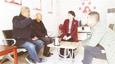 在新風(fēng)胡同社情速遞服務(wù)站,社區(qū)工作人員(右一、右二)正在和居民聊天。