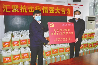 短短3天時間,口腔醫(yī)學(xué)系師生捐款3萬余元。系黨總支從黨建經(jīng)費(fèi)中籌措捐贈3000元。他們買了5噸84消毒液。針對農(nóng)村疫情防控物資缺乏的情況,他們將5噸消毒液捐給貧困村。