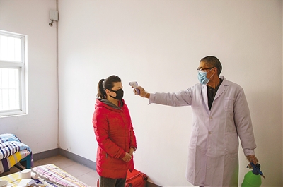 3月2日下午,在漯河市救助站二樓女區(qū),吃過午飯,余旺梅像往常一樣在房間內(nèi)休息,看手機上關(guān)于疫情進(jìn)展情況,然后測量體溫。余旺梅是一名月嫂,有時候,她還會看看書,或者練習(xí)一下按摩手法,為以后找工作做準(zhǔn)備。