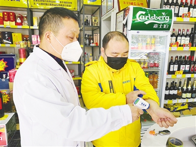 王黎明給商鋪店員測(cè)量體溫。