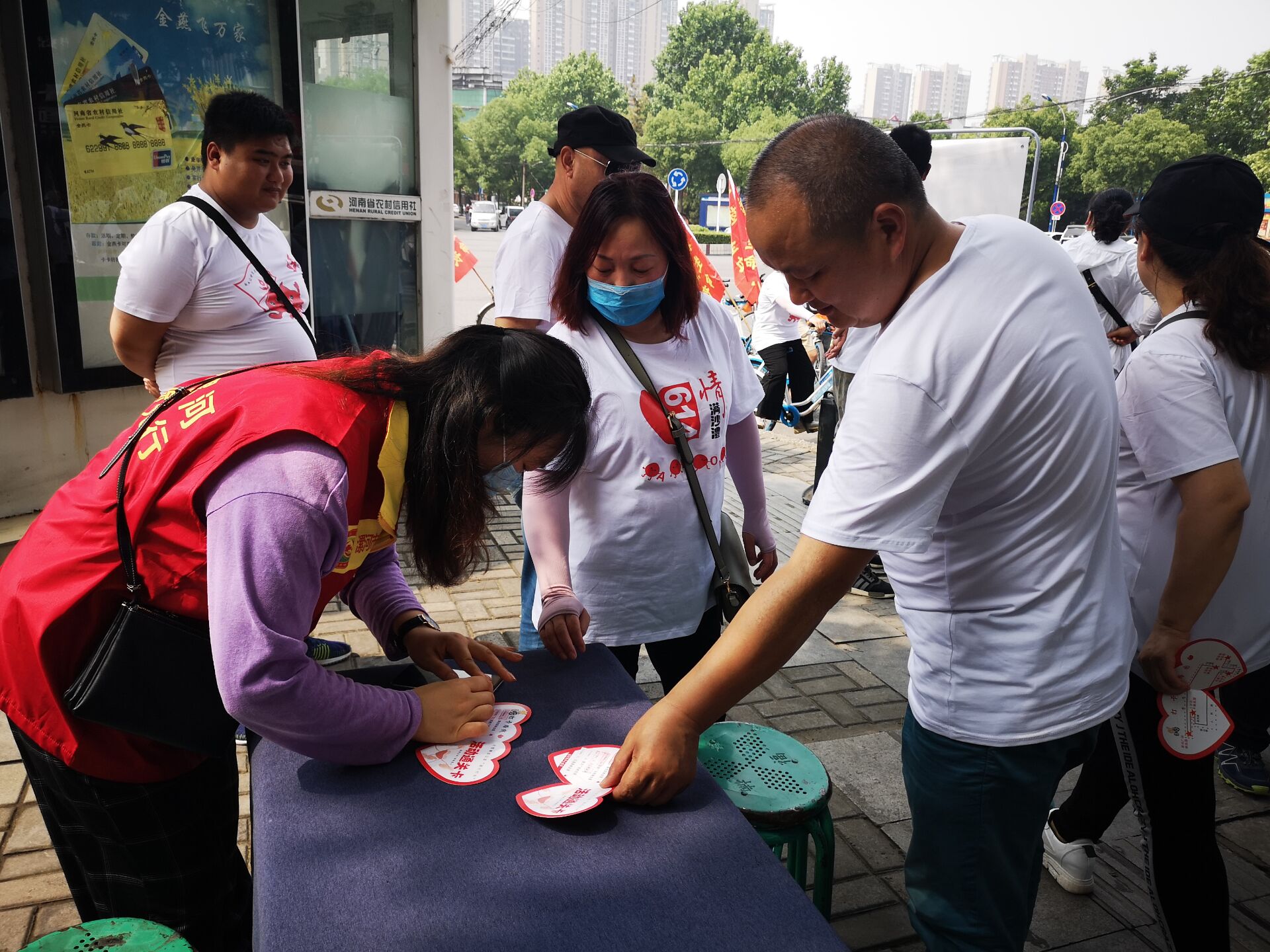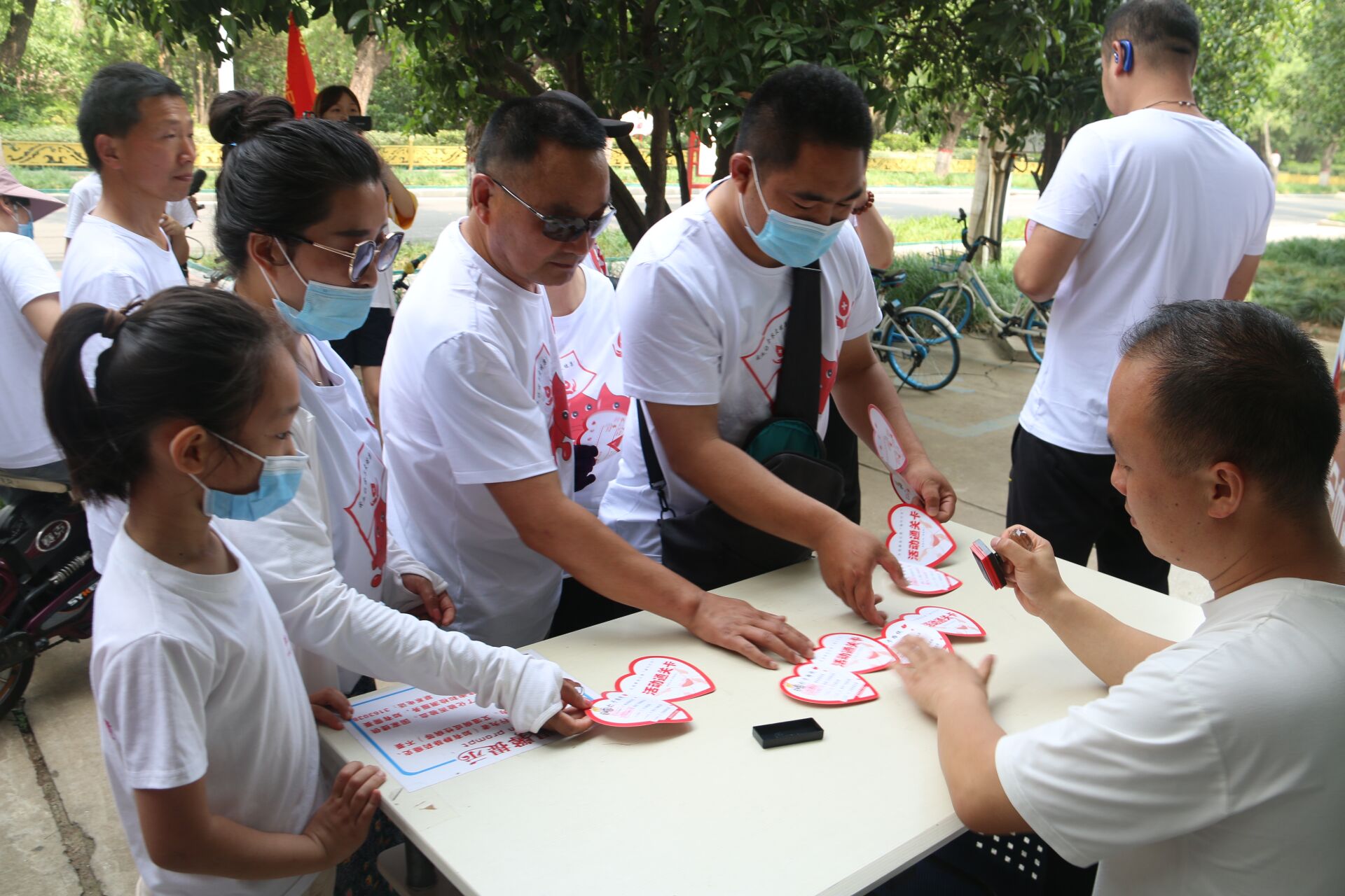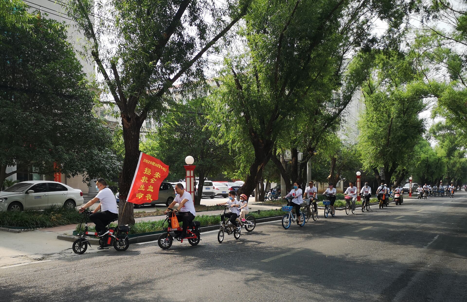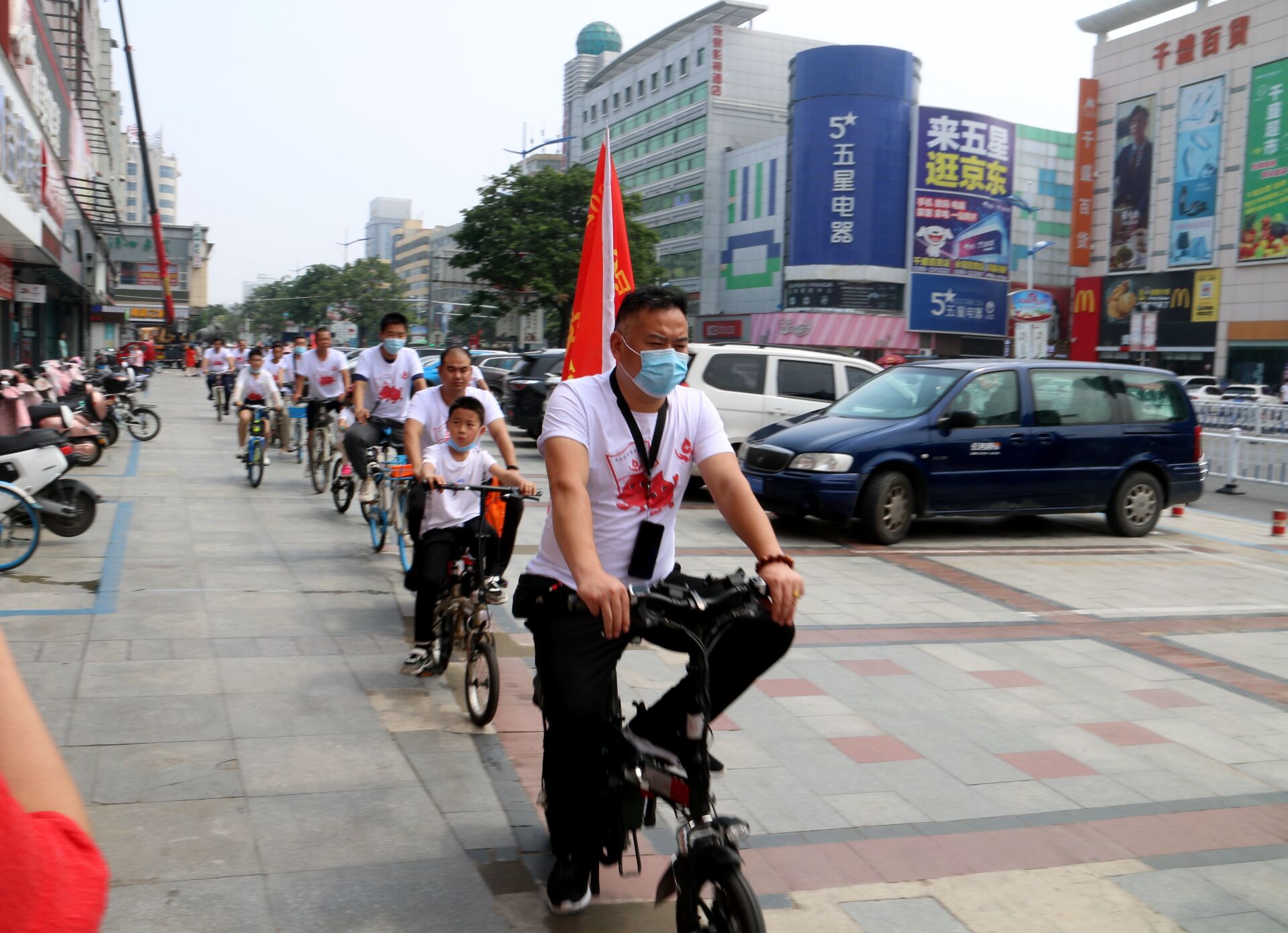 6月14日上午9時,志愿者們身穿統(tǒng)一服裝,車上綁上小紅旗,分多個小組從市區(qū)解放路006號獻(xiàn)血屋出發(fā),沿市內(nèi)主要干道依次到昌建廣場南獻(xiàn)血屋、沙北獻(xiàn)血屋、黃河廣場獻(xiàn)血屋與宣傳海報合影留念打卡簽到,最終到交通路001號獻(xiàn)血屋終點(diǎn)站完成全部騎行打卡路線。幾十米長的騎行隊(duì)伍,吸引路人、商鋪店員等矚目觀望,成為我市街頭一道靚麗的風(fēng)景線。