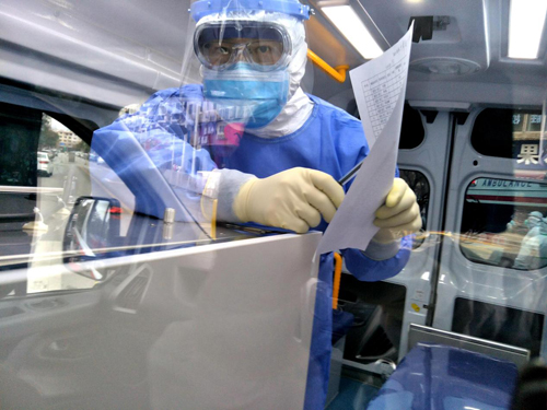 下午接到新的任務(wù),其中需要轉(zhuǎn)運一位女性患者。剛剛開車,她的電話就響了起來。董晶兵護士就提醒她,因為車上還有其他患者,在車上請保持安靜,最好不要打電話。她看了看手機,說家里有一個一歲半的兒子剛斷奶一星期多都沒見了,是家里打的電話,說著說著就哭了起來。同車的患者了解她的情況后表示理解,一致同意讓她接了電話。董晶兵看了看她的轉(zhuǎn)診信息,年齡才33歲,比自己大一歲。聽著她和家人交談的話語,董晶兵也想起了自己的孩子。兒子比她孩子小兩個月,昨晚視頻還叫爸爸了??粗矍暗膱鼍埃П幌伦訉嵲跊]忍住,淚水瞬間流了下來。