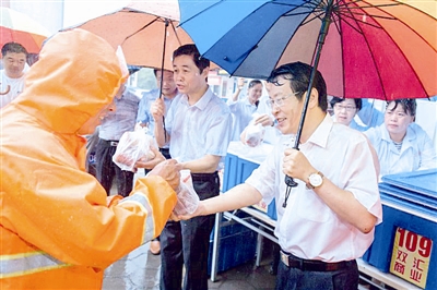 (記者 劉 丹 版式 付廣亞)市委書記蒿慧杰冒雨看望堅守一線的環(huán)衛(wèi)工人,并送上免費愛心早餐。