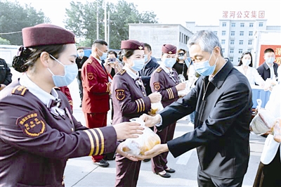 “情系公交司機”愛心早餐工程啟動儀式上,市人大常委會副主任、市總工會主席陳平為公交司機發(fā)早餐。