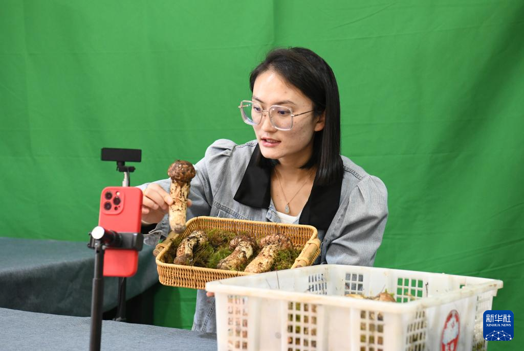 7月5日,工作人員在云南省麗江市松茸交易中心直播帶貨松茸。