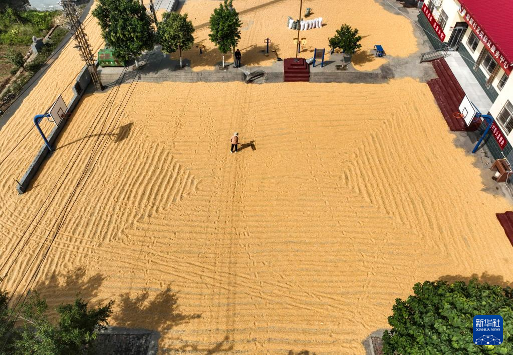 10月4日,河南省濟源市克井鎮(zhèn)勛掌新村農(nóng)民在晾曬玉米(無人機照片)。