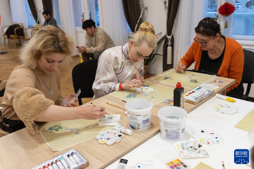 1月17日,在匈牙利布達佩斯,人們在“指尖上的非遺——中國文化體驗日”為主題的2025“歡樂春節(jié)”活動上體驗中國繪畫。