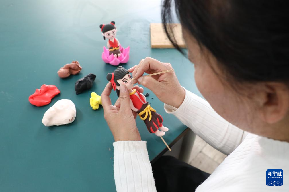 2月20日,泥塑藝人楊愛華在山東省濱州市的一所小學(xué)創(chuàng)作哪吒主題泥塑。