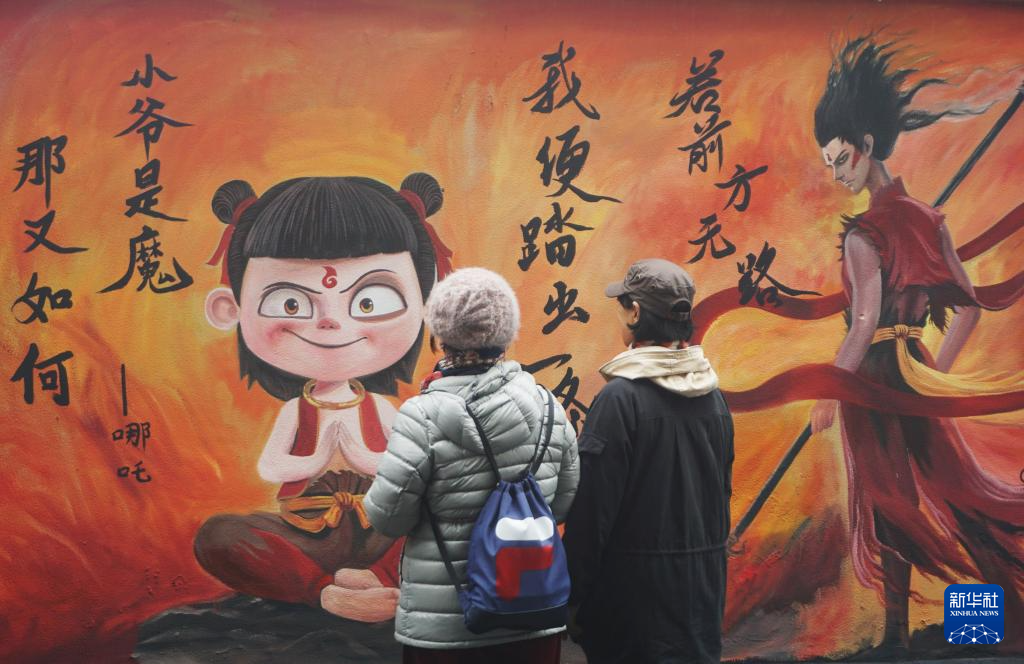 2月20日,市民在杭州街頭觀看哪吒主題墻繪。