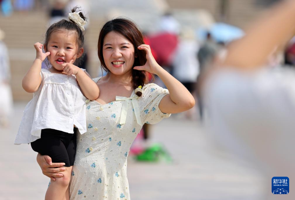5月3日,家長(zhǎng)帶著孩子在海南省三亞市南山文化旅游區(qū)游覽。