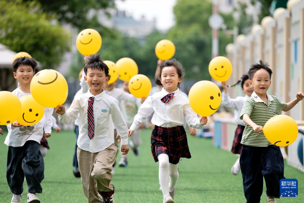 5月6日,浙江省湖州市長(zhǎng)興縣實(shí)驗(yàn)幼兒園的孩子們手舉笑臉氣球,進(jìn)行“笑臉賽跑”小游戲。
