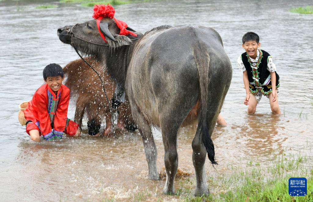 5月5日,在廣東省清遠(yuǎn)市連山壯族瑤族自治縣上帥鎮(zhèn)東君村,身著壯族服飾的小朋友在中洲河里沐牛。