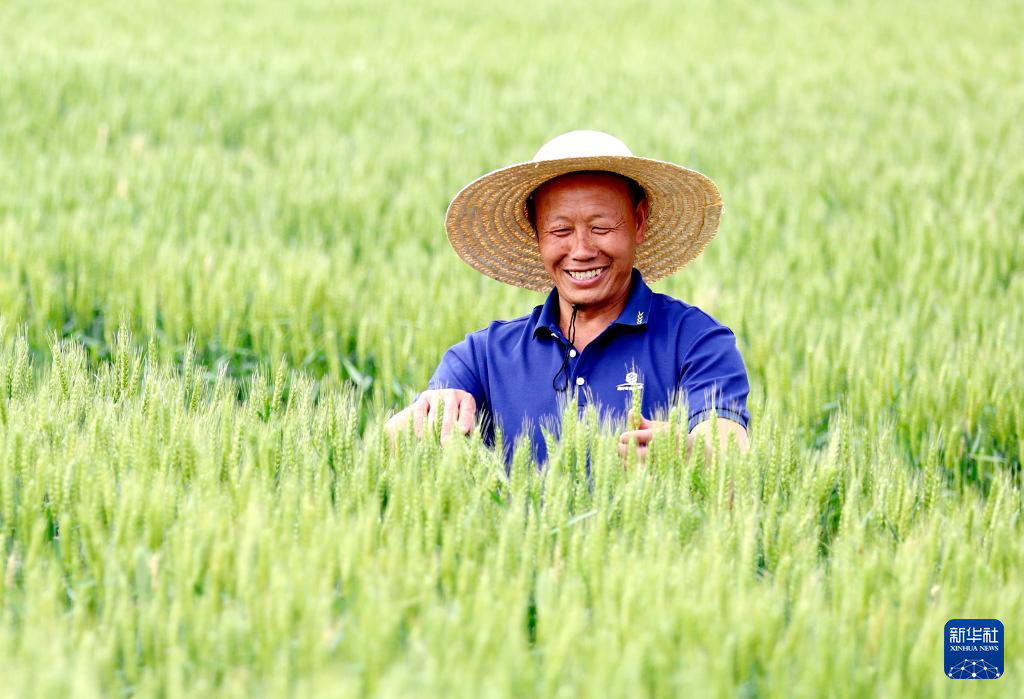 5月5日,山東省臨沂市郯城縣郯城街道陵坡村村民在田間查看小麥長(zhǎng)勢(shì)。