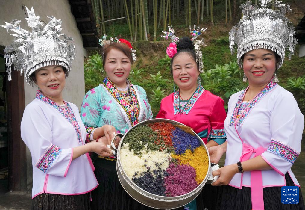 5月5日,在廣西融水苗族自治縣懷寶鎮(zhèn)盤榮村,群眾在展示五色飯。