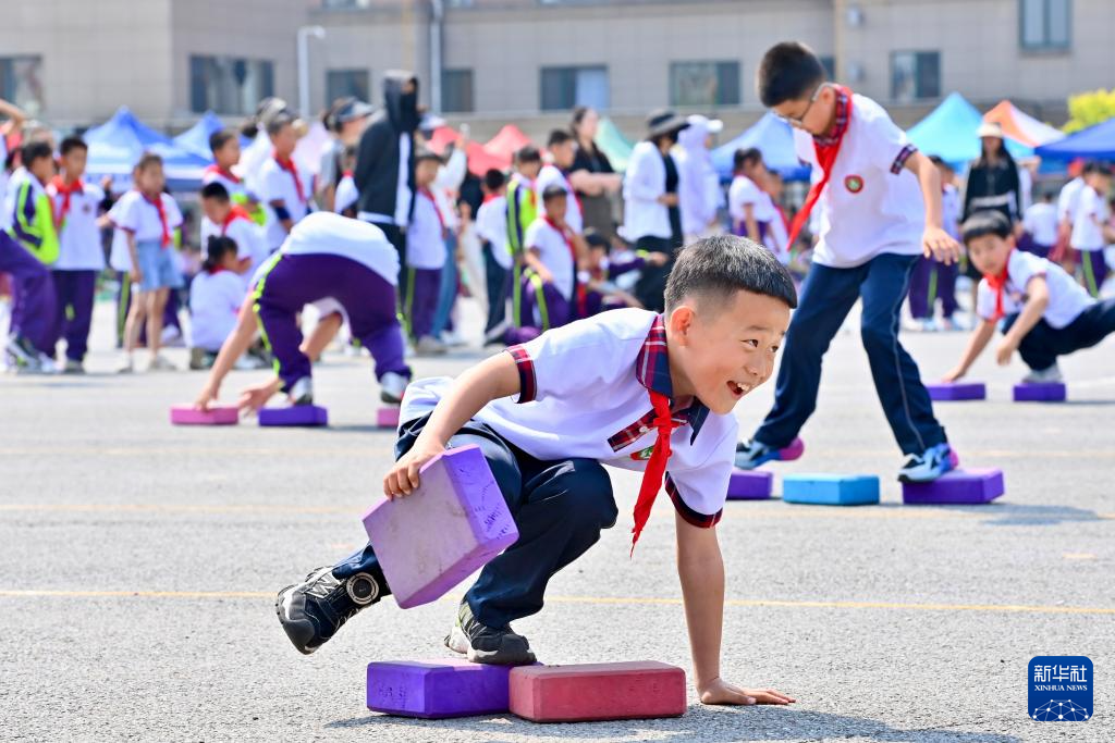 5月30日,在遼寧省鞍山市岫巖滿族自治縣實(shí)驗(yàn)小學(xué),學(xué)生在趣味運(yùn)動會上進(jìn)行“移石過河”游戲。