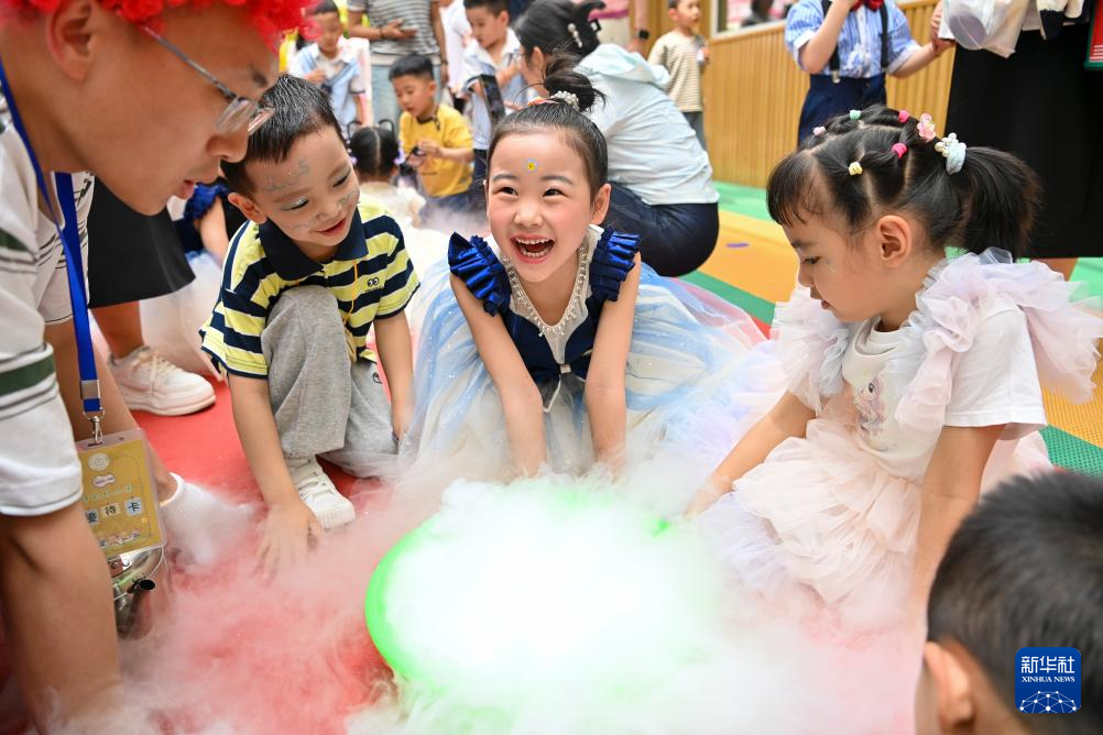 5月30日,山西省太原市迎澤區(qū)師苑幼兒園的小朋友在慶祝“六一”主題活動中觀看干冰實(shí)驗(yàn)。
