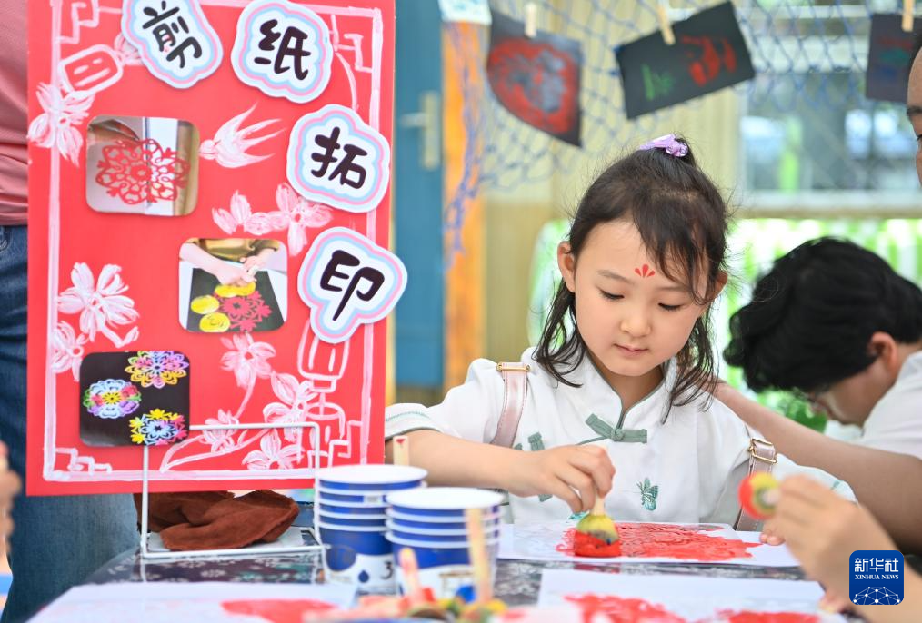5月30日,山西省太原市迎澤區(qū)師苑幼兒園的小朋友在慶祝“六一”主題活動中體驗(yàn)剪紙拓印。