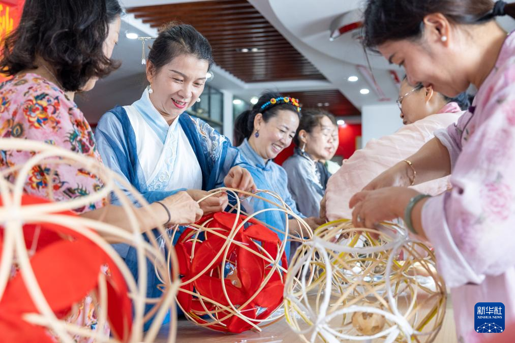 9月28日,在浙江省溫嶺市橫峰街道馬鞍橋村文化禮堂,居民們制作“滾燈”。