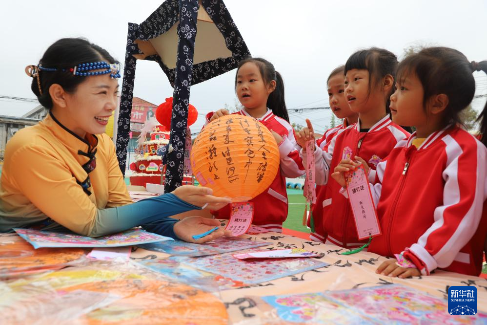 9月28日,在山東省濱州市沾化區(qū)馮家鎮(zhèn)李家幼兒園,孩子們?cè)?ldquo;拾趣品中秋 童心迎國(guó)慶”活動(dòng)上猜燈謎。