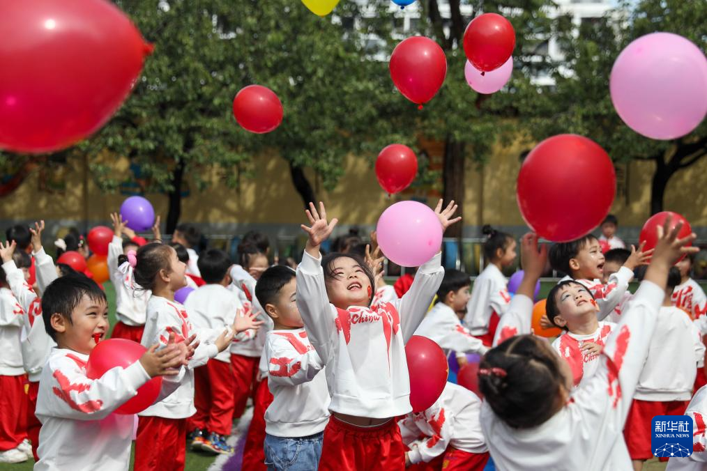 9月29日,河南省平頂山市寶豐縣鬧店鎮(zhèn)中心幼兒園的孩子們?cè)诜棚w氣球。