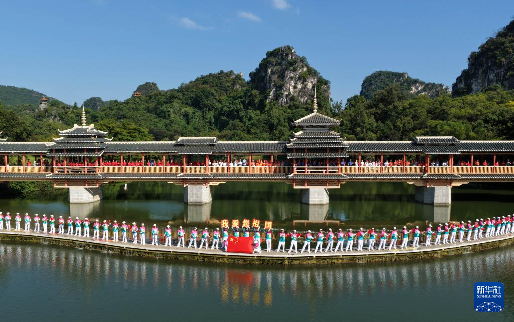 9月28日,在廣西柳州市龍?zhí)豆珗@,人們共同唱響《我和我的祖國(guó)》(無(wú)人機(jī)照片)。