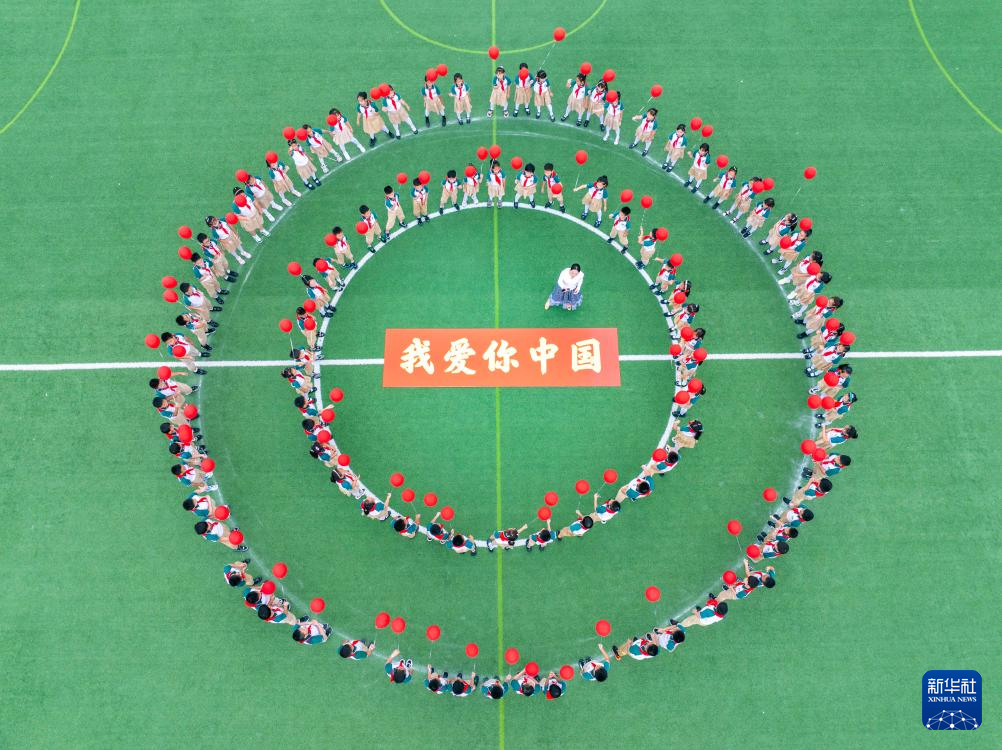 9月28日,江蘇省泰州市姜堰區(qū)東橋小學(xué)教育集團(tuán)東板橋校區(qū)學(xué)生學(xué)唱愛(ài)國(guó)歌曲,迎接國(guó)慶節(jié)(無(wú)人機(jī)照片)。
